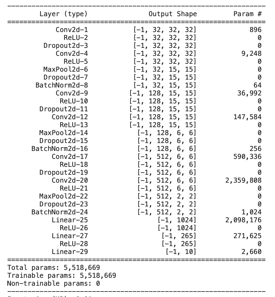 Influenced by the architecture of AlexNet, I progressively increased the out-channel size by a factor of 4 as we moved deeper into the convolutional layers. This strategy allowed the network to capture more complex features and gain a deeper understanding of the dataset. To downsample the feature maps and reduce the dimensions, I incorporated max pooling after every two layers. This process reduced the spatial resolution by a factor of 2 while retaining the most salient features.