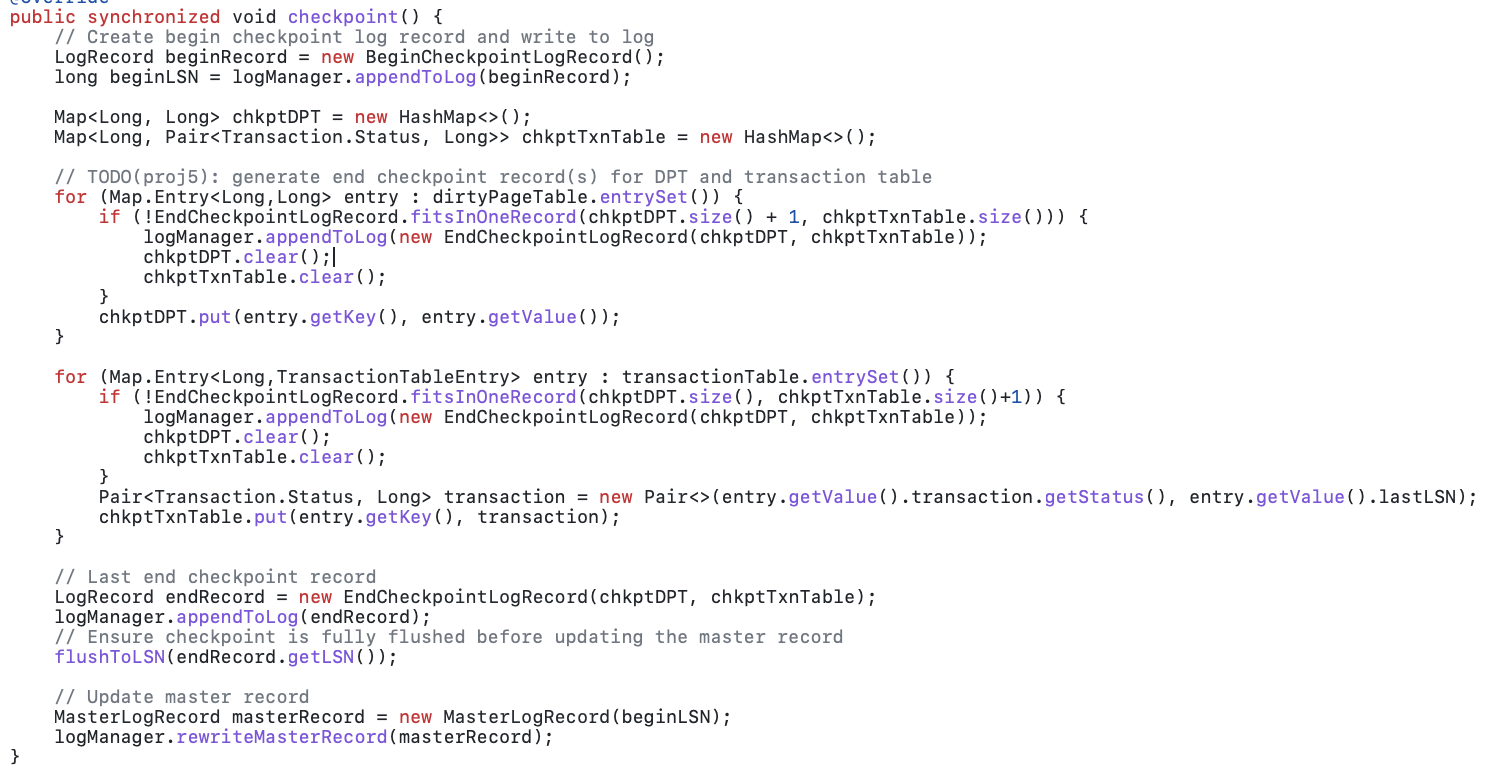 Savepoints and Checkpoints: We implemented savepoints for partial rollbacks whose logic was extremely similar to undoing changes in rollbacktoLSN(). In case of checkpoints, we implemented a fuzzy checkpoint using the helper function EndCheckpoint.fitsInOneRecord(# of dpt entries, # of txnTable entries) to check the page where EndChekpoint is located. The code for checkpoint is attached below.