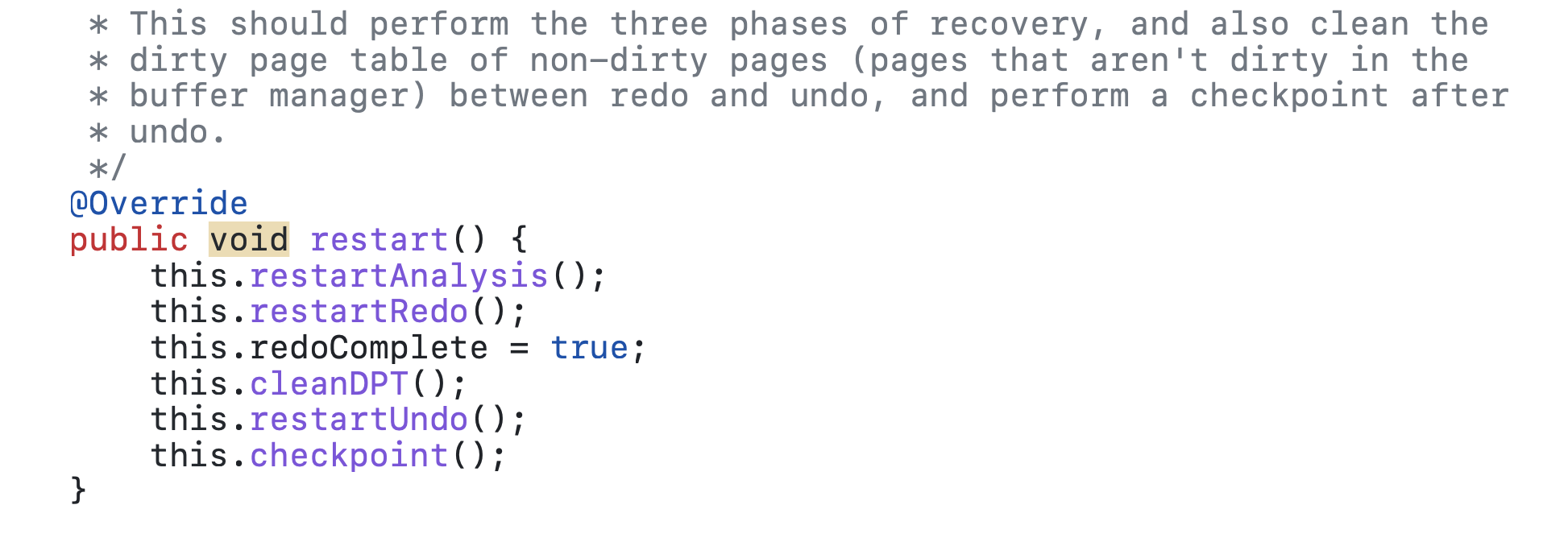 In restart, the ARIES algorithm is used for data recovery, the committed transaction is ended, and the uncommitted transaction is aborted and rolled back. We implemented three stages: restartAnalysis(), restartRedo() and restartUndo(). In addition to the three phases of recovery, the restart method does two things: